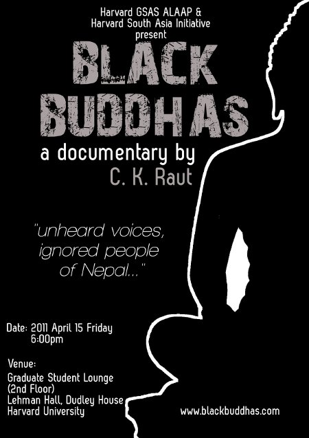 The documentary 'Black Buddhas' is the story of 12 million Madheshis, living in Madhesh or Tarai, the southern plain region of Nepal. It is a revealing story about the land that has remained mostly unknown to the world, and about people whose voices have remained mostly unheard so far. Dr. C. K. Raut brings forth their lives and voices as he travels from the east to the west part of the country. The documentary explores the socio-economic condition of Madheshis, in their own voices from the grassroots level. It also investigates the long history of "racial and regional" discrimination against Madheshis by the state leading up to the massive movement of 2007-8 and the subsequent killings of dozens of Madheshis. The director will be present at the occassion.