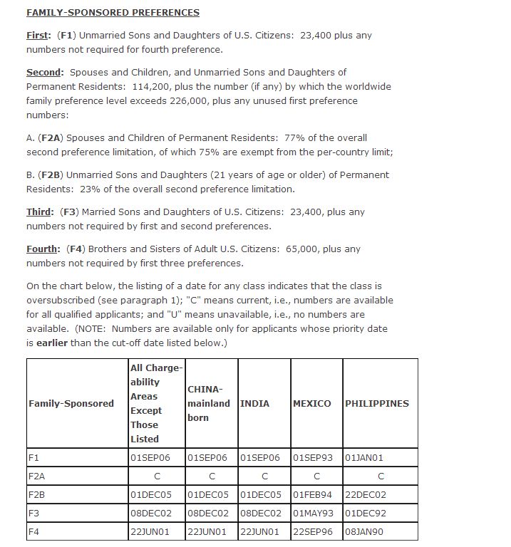 “Immediate relatives” of a U.S. citizen, defined as one’s spouse, unmarried children under the age of 21, and parents, always have a visa number immediately available and are discussed in the “Green Card for an Immediate Relative of a U.S. Citizen” link to the left.